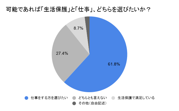 「生活保護をもらう」ことと「生活できるだけの収入がある仕事をする」ことのどちらを選ぶか、という問いに対し、全体の約62%にあたる356人が「仕事をする方を選びたい」と回答しました。