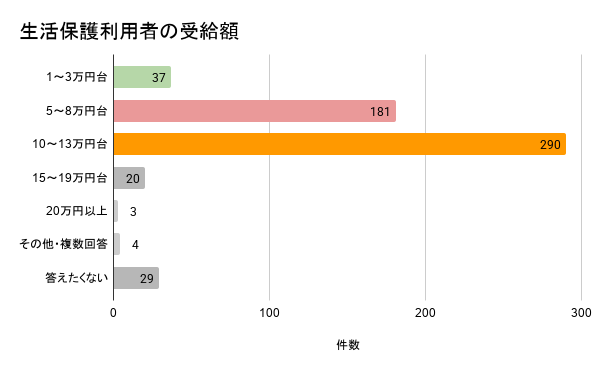 実際に受給を開始した後の月々の受給額については、「10~13万円台(290人)」と「5~8万円台(181人)」が大半を占めており、決して余裕のある金額ではないことがわかります。世間の一部にある「楽をして支援を受けている」というイメージとは裏腹に、当事者たちは切り詰めたギリギリの状況で毎日を生き抜いています。